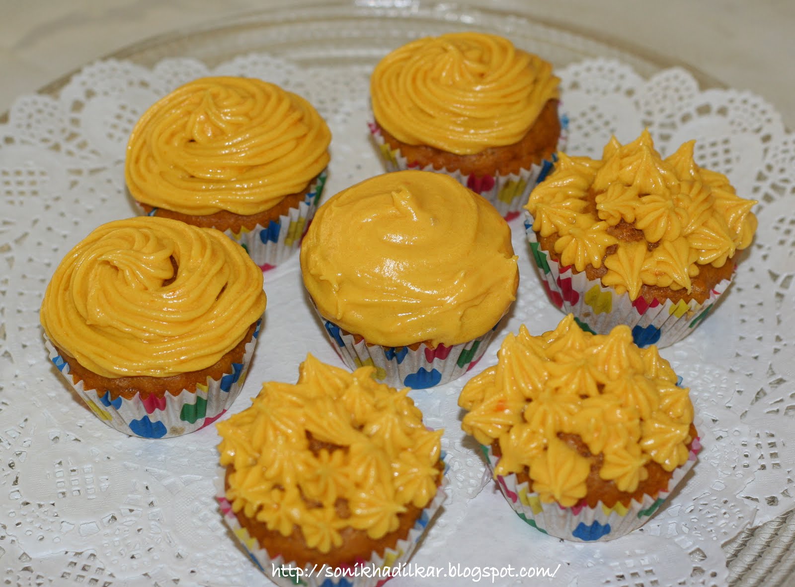 - Place on a wire rack to cool for five minutes and then remove muffins. Serve warm or at room temperature. Prepare the mango frosting by mixing all the ingredients, pipe it with a regular mango flavoured buttercream frosting using the star tip.